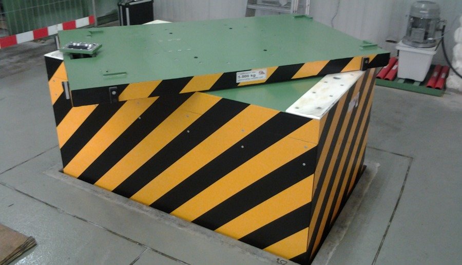 Entwicklung, Konstruktion und Lieferung von einem Hubtisch mit drehbarer Plattform für die Entnahme von 5t-Lasten aus einer EHB. Besonderheit: Überfahrbarkeit mittels Flurförderfahrzeugen |