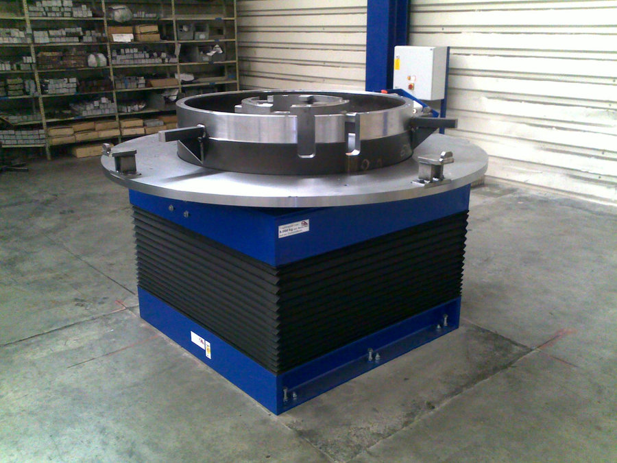 Konstruktion und Lieferung eines elektrohydraulischen Scherenhubtisches mit elektrischer Drehfunktion der Aufnahmeplatte. Entwickelt für die Produktion von Nutzfahrzeugreifen |