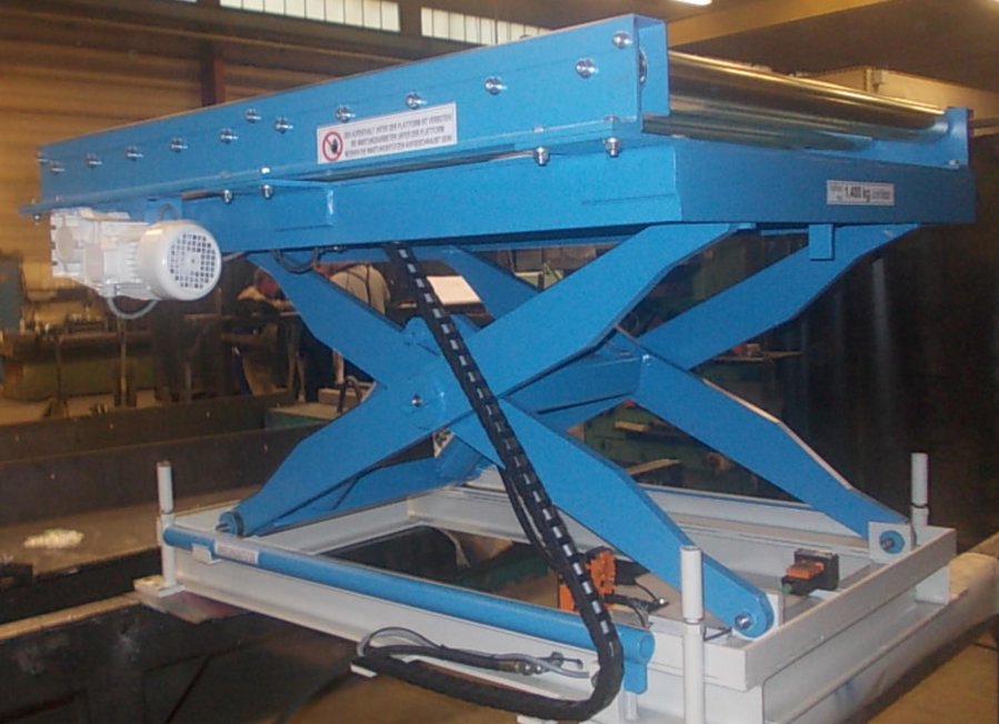 Konstruktion und Lieferung von hydraulischen Scherenhubtischen mit aufgebauter Rollenbahn als Palettenstapelgerät |